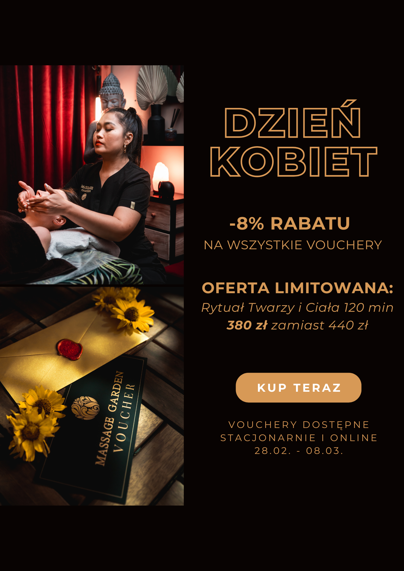 Oferujemy vouchery i karnety na wszystkie masaże. Proponujemy również promocyjne pakiety na serię liftingujących masaży twarzy kobido, masaży antycellulitowych oraz masaży pleców.